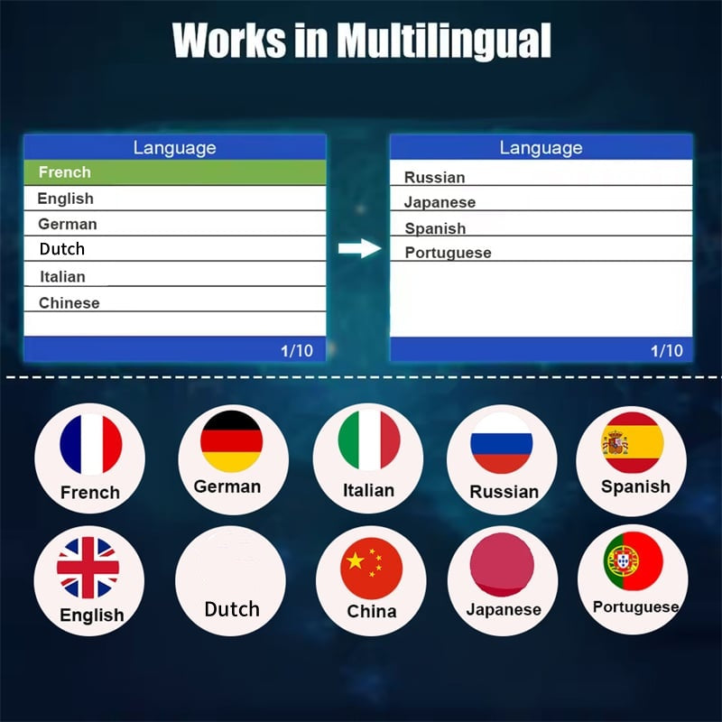 SOPORTE MULTILINGÜE: Admite 10 idiomas: inglés, alemán, francés, español, italiano, ruso, neerlandés, chino, japonés y portugués, ideal para conductores internacionales.